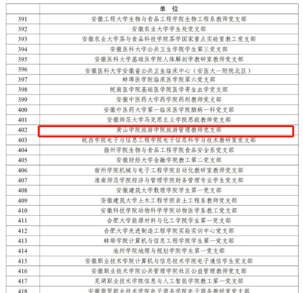 深入实施党建品牌提升计划。出台《黄山学院党的基层组织建设“强基础、提质量、创品牌”三年行动计划(2022-2024年)》。为提升党建工作水平和质量,积极申报并立项全国党建“双创”样板支部1个,省级党建“双创”标杆院系2个、样板支部5个。开展了校级新时代党建示范创建和质量创优评选,立项了校级党建“双创”标杆院系4个、样板支部11个。