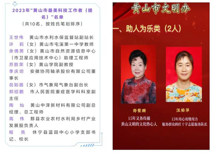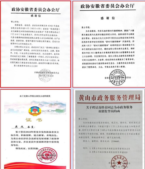 拓宽统战成员社会服务平台。制定《黄山学院“创新发展·高校在行动”主题实践活动实施方案》,支持统战成员立足自身专业优势,依托“双树双建”五个一行动,用好项目合作、科研支撑、教师工作站、乡村振兴和志愿服务五大平台。采用“统战搭台、企业出题、教师揭榜”的模式,就乡村振兴、教育教学、旅游生态发展等相关问题提出优化建议,申报相关课题43项、选派工作站进驻教师6人,开展产学研合作17次,发表论文4篇,先后组织实施扶贫帮困、义务支教、法治宣传、科技服务等志愿活动40余次,服务师生群众2000多人次。九三学社社员苏胜荣获九三学社省委和省科协“优秀专家”称号、“黄山市最美科技工作者和优秀科技志愿者”荣誉称号;民盟盟员郑紫珊获2023年度黄山好人荣誉称号。
