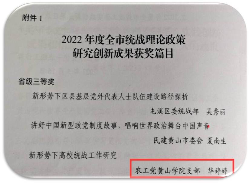 健全党外代表人士数据库,加强党外代表人士日常培养,五年来,我校党内外代表人士相继担任各级“两代表一委员”13名,1名成员推荐担任黄山市知联会副会长,1名成员推荐担任黄山市侨联副主席,安排4名成员到地方挂职锻炼。2022年我校“侨胞之家”获省侨联通报表扬,黄山学院归国华侨联合会获2023年“黄山市侨务工作先进集体”荣誉称号,3名成员获“黄山市侨务工作先进个人”荣誉称号。
