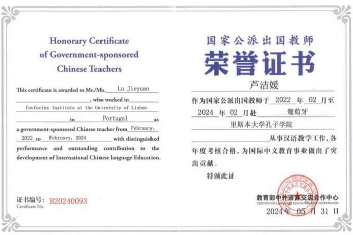 我校教师芦洁媛获颁国家公派出国教师荣誉证书
