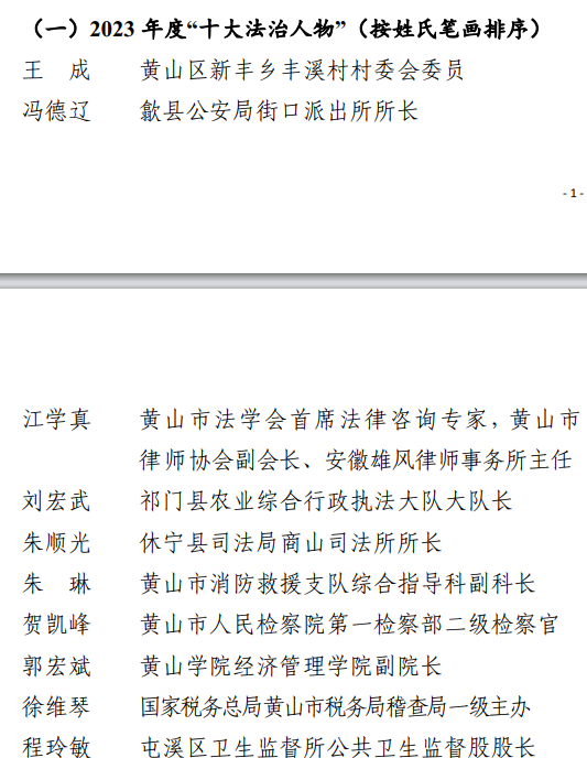 近日,中共黄山市委全面依法治市委员会办公室、黄山市司法局、黄山市法治宣传教育工作领导小组办公室就黄山市2023年度“十大法治人物”及“十大法治事件”评选结果联合发文,我校经济管理学院副院长郭宏斌获评黄山市2023年度“十大法治人物”。