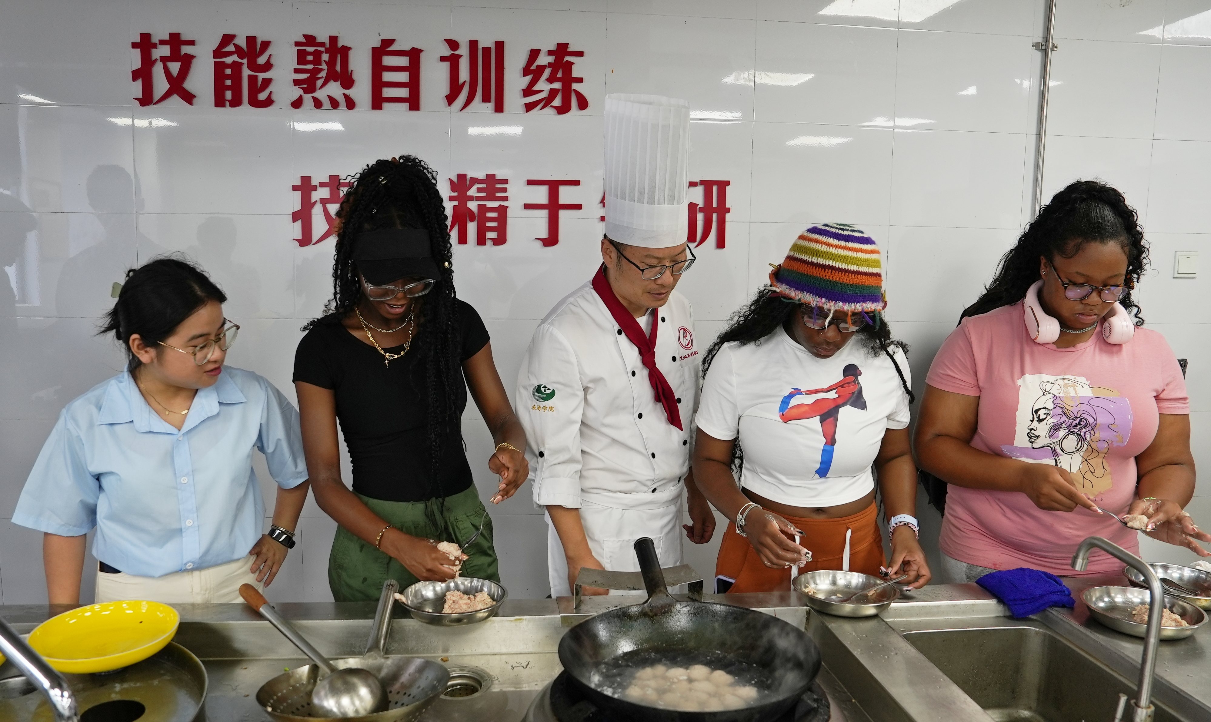 座谈会后,马里兰州师生代表团一行先后参加书法研习、徽州板凳龙与五禽戏体验、徽菜烹饪制作等系列研学活动。在书法研习环节,指导教师以汉字“和”为例,讲解了执笔方法、书写姿势和运笔技巧,让代表团成员在笔走龙蛇间领略中国书法的独特魅力;在徽州板凳龙与五禽戏体验活动中,他们跟随指导教师认真演练每一个动作,深切感受徽州民俗文化的乐趣与中国传统武术的精深;在徽菜烹饪制作环节,他们亲自动手并现场品尝徽州传统美食,对美味可口的徽菜称赞不已。马里兰州东方科技学校的学生中林雅依·泰特(Nakabayashi Taite)兴奋地说:“黄山学院真是一所充满活力的高校,这里的文化体验让我受益匪浅,非常难忘。”