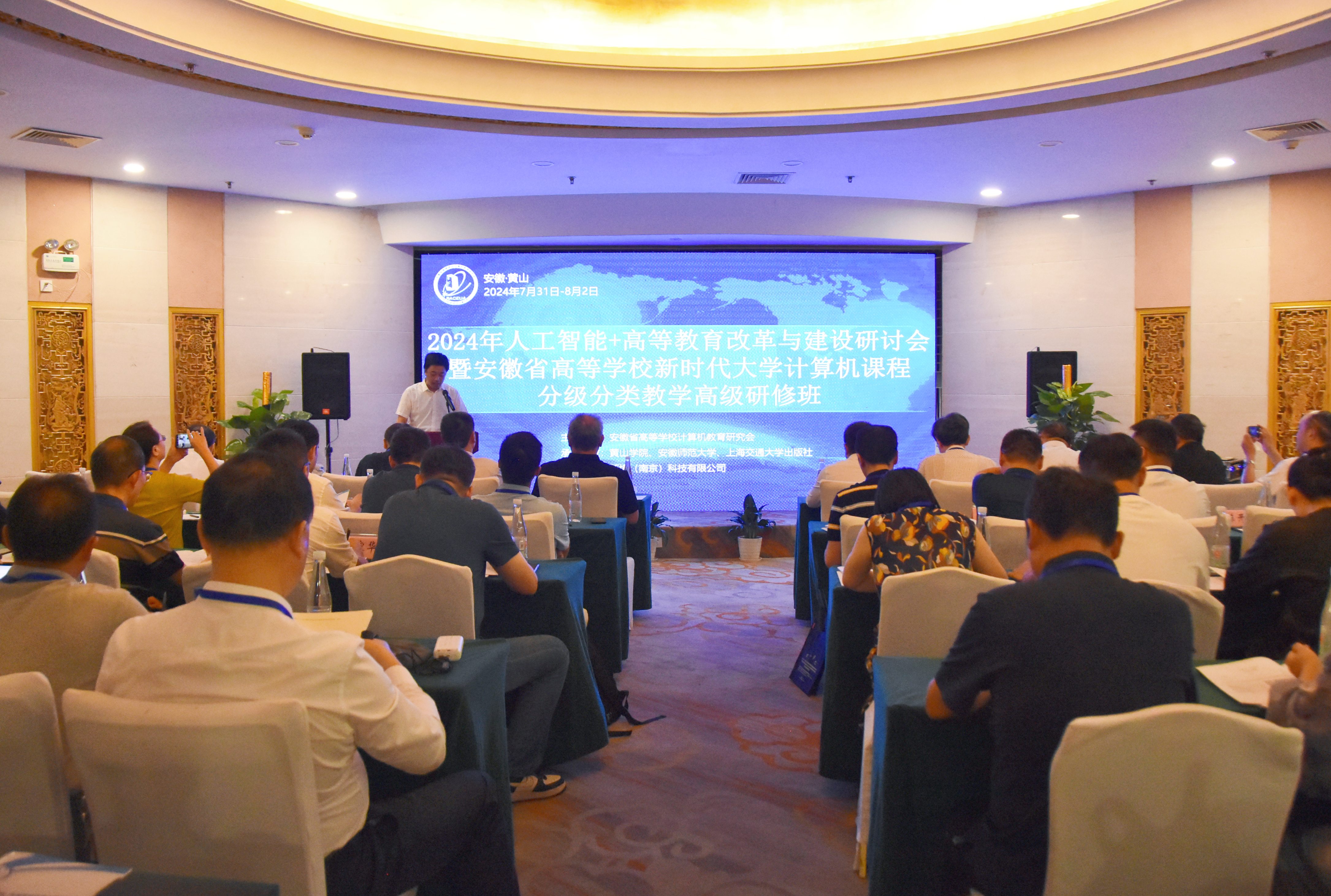 7月31日-8月2日,由安徽省高等学校计算机教育研究会主办,黄山学院、安徽师范大学、上海交通大学出版社承办的“2024年人工智能+高等教育改革与建设研讨会暨安徽省高等学校新时代大学计算机课程分级分类教学”高级研修班在黄山国际大酒店顺利开班。安徽省高等学校计算机教育研究会理事长胡学钢教授,安徽省高等学校计算机教育研究会副理事长王浩教授,安徽师范大学副校长景晓军教授,全国高校计算机基础教育研究会副会长桂小林教授,国际人工智能产业联盟产业研究院院士、江南大学研究生院院长吴小俊教授,上海市计算机基础教育协会理事长、同济大学杨志强教授,全国高等学校(安徽考区)计算机水平考试专家组组长郑尚志教授等来自全国30余所高校的80余名教师参会,我校党委副书记、院长李庆宏出席开幕式并致欢迎辞,信息工程学院党政领导及10余名教师参加会议。