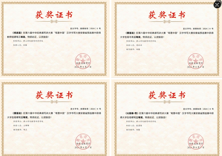 近日,由安徽省教育厅、安徽省语言文字工作委员会联合主办的第六届中华经典诵写讲大赛暨“笔墨中国”汉字书写大赛安徽省预选赛圆满结束。我校在此次大赛中喜获佳绩。