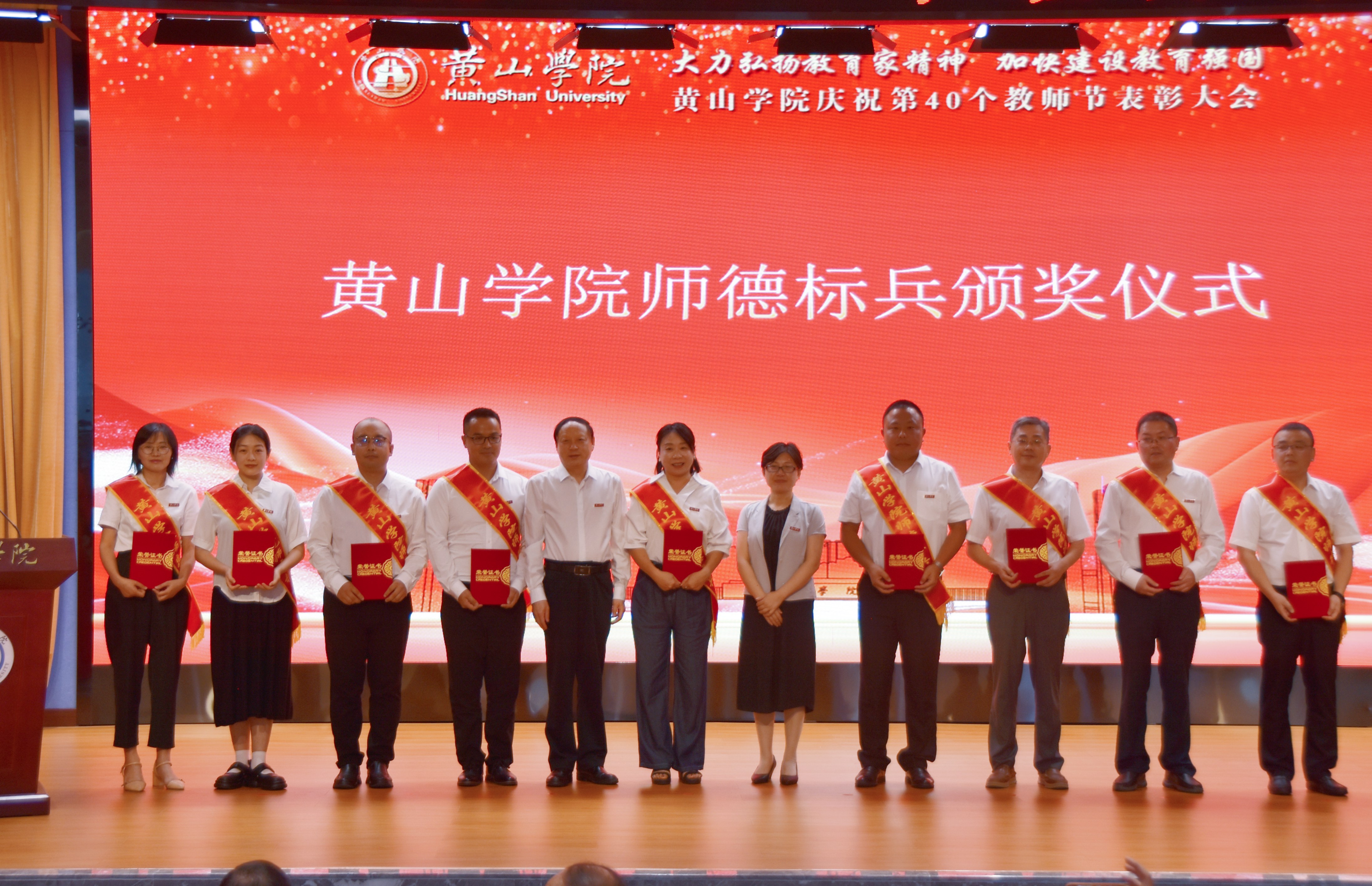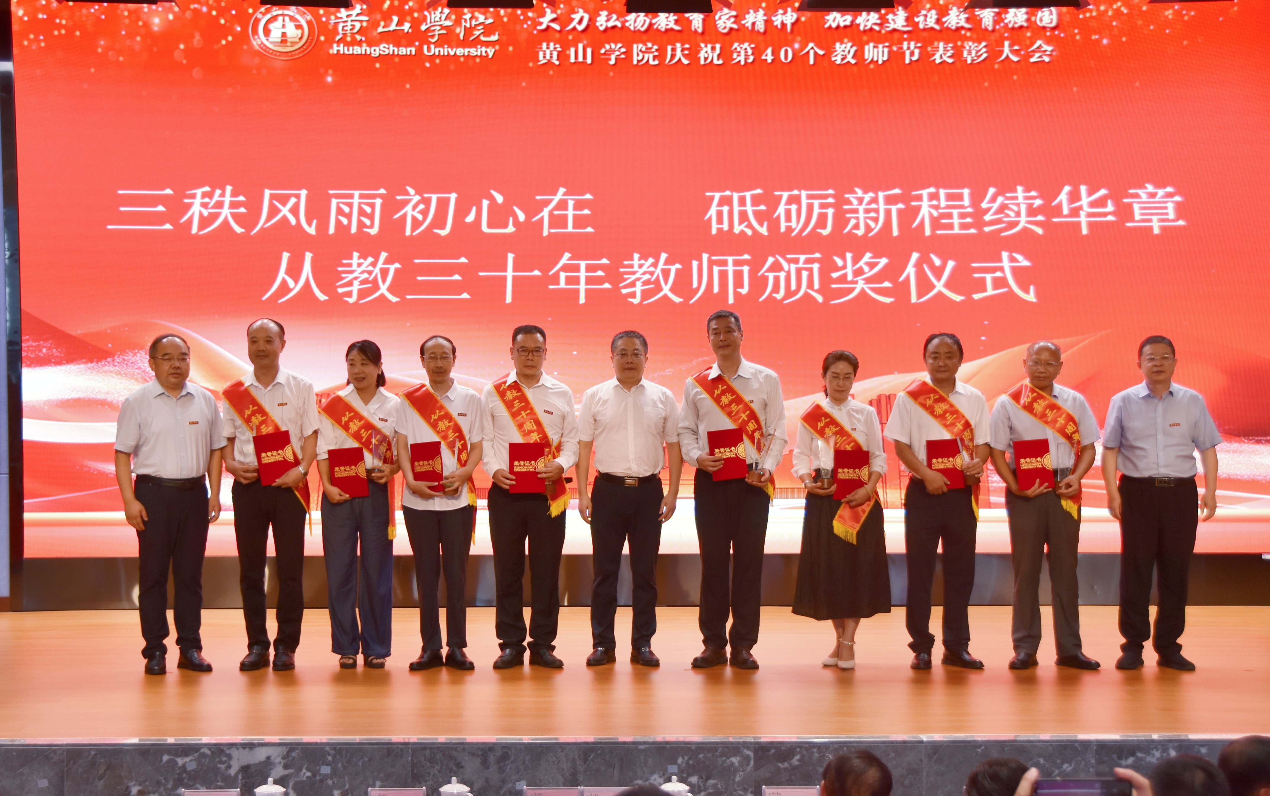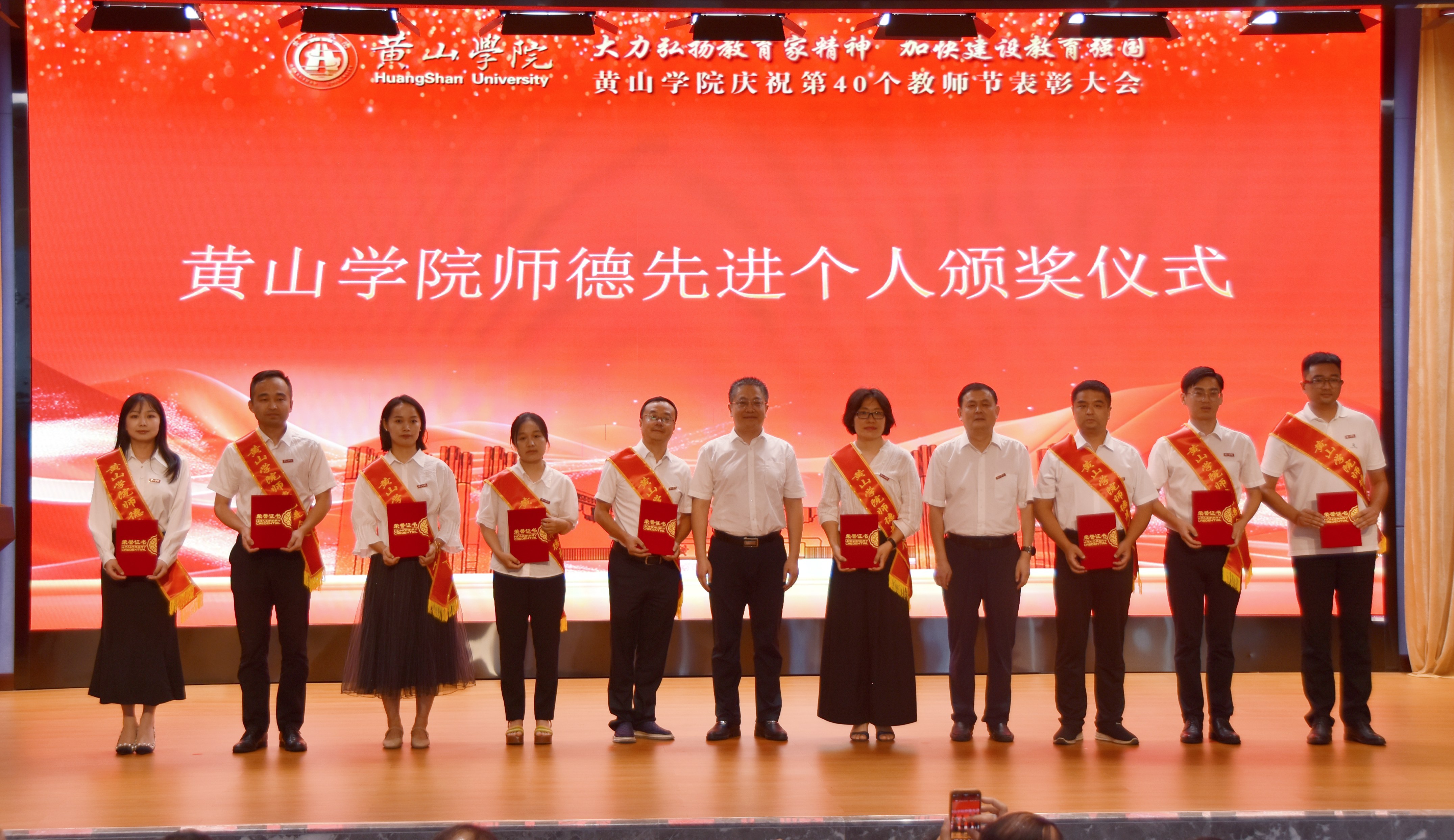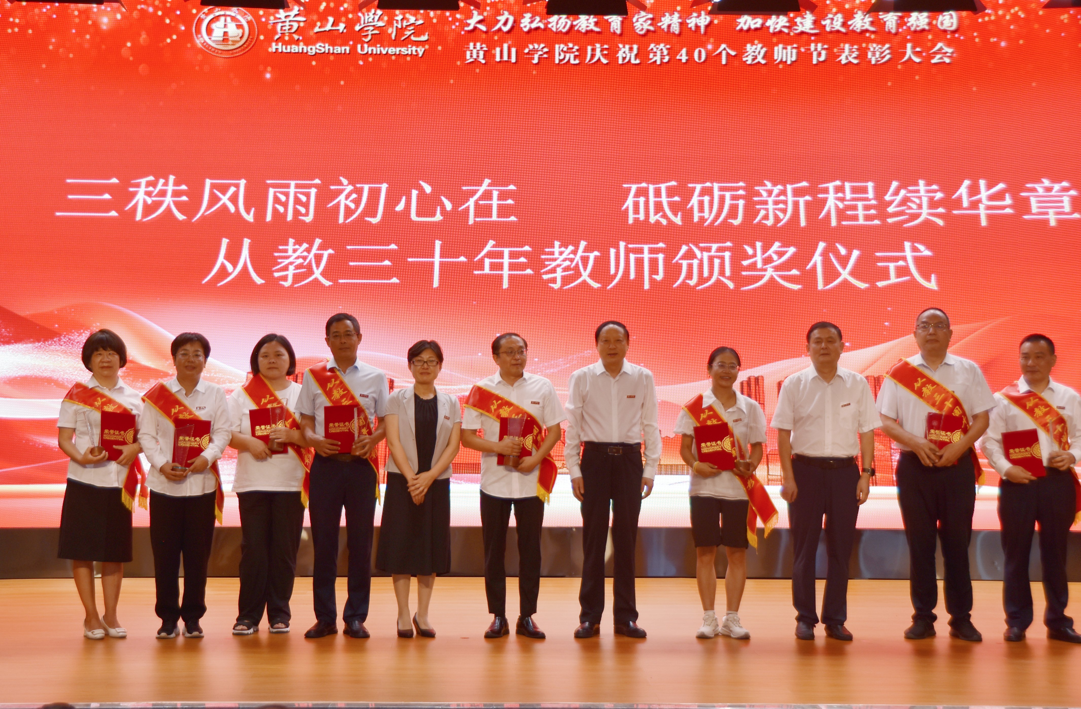 会上,表彰了从教三十年教师、安徽省优秀教师、黄山学院师德标兵和师德先进个人。校党委委员、副院长张小明,校党委委员、纪委书记、监察专员胡海生宣读了表彰文件。校领导为受表彰教师颁发了奖杯和证书,新进教师代表和学生代表上台为获奖教师献上鲜花。