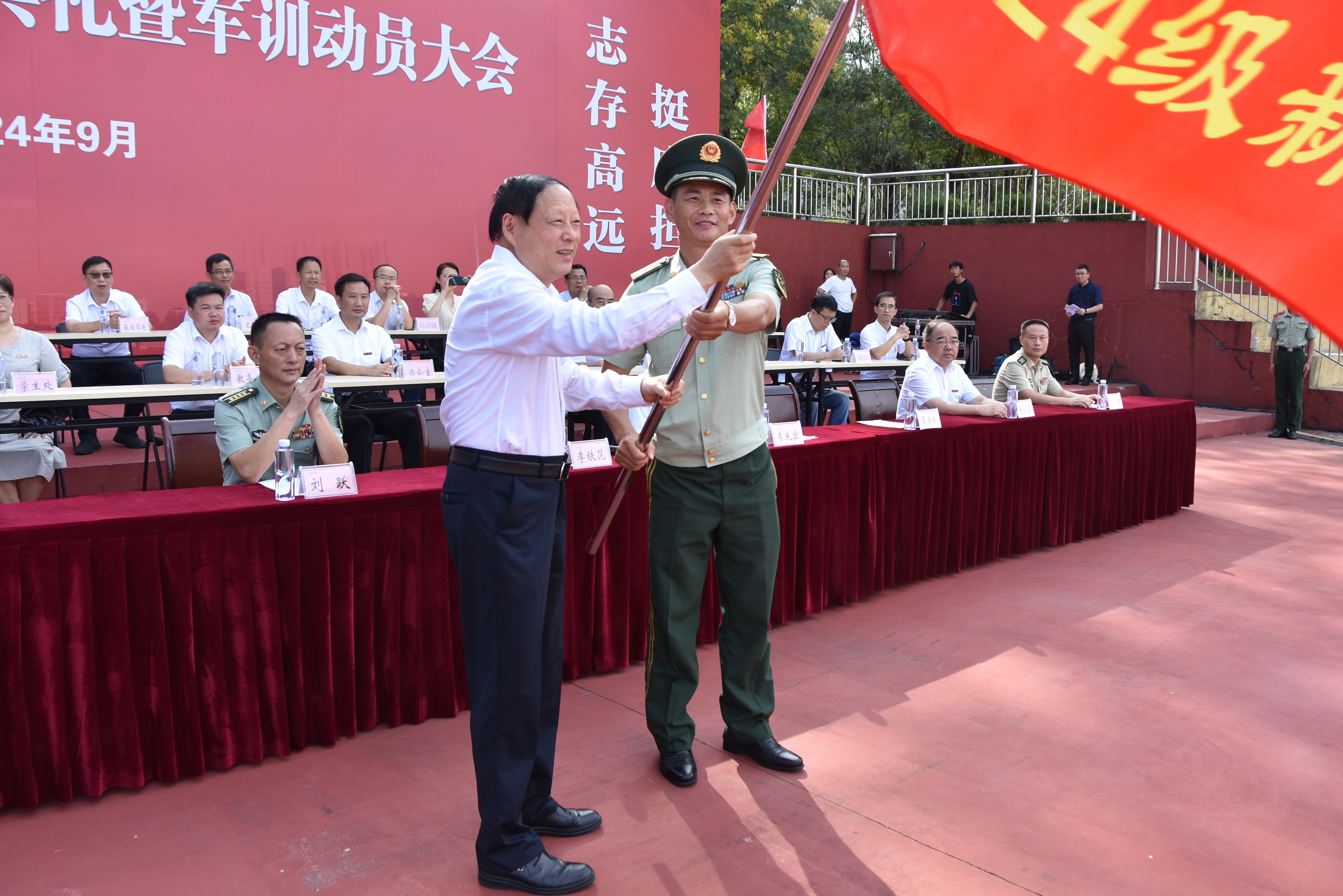 典礼上,校党委书记李铁范向承训部队授军训团团旗。
