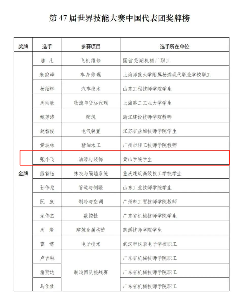 世界技能大赛被誉为“世界技能奥林匹克”,是最高层级的世界性职业技能赛事,其竞技水平代表了各领域职业技能发展的世界先进水平。本届世界技能大赛于9月10日至15日在法国里昂举办,中国代表团参加了全部59个项目的比赛,共获得36枚金牌、9枚银牌、4枚铜牌和8个优胜奖,位居金牌榜、奖牌榜和团体总分首位。安徽参赛选手夺得2金1铜,获得我省选手参加世界技能大赛历史的最佳成绩。