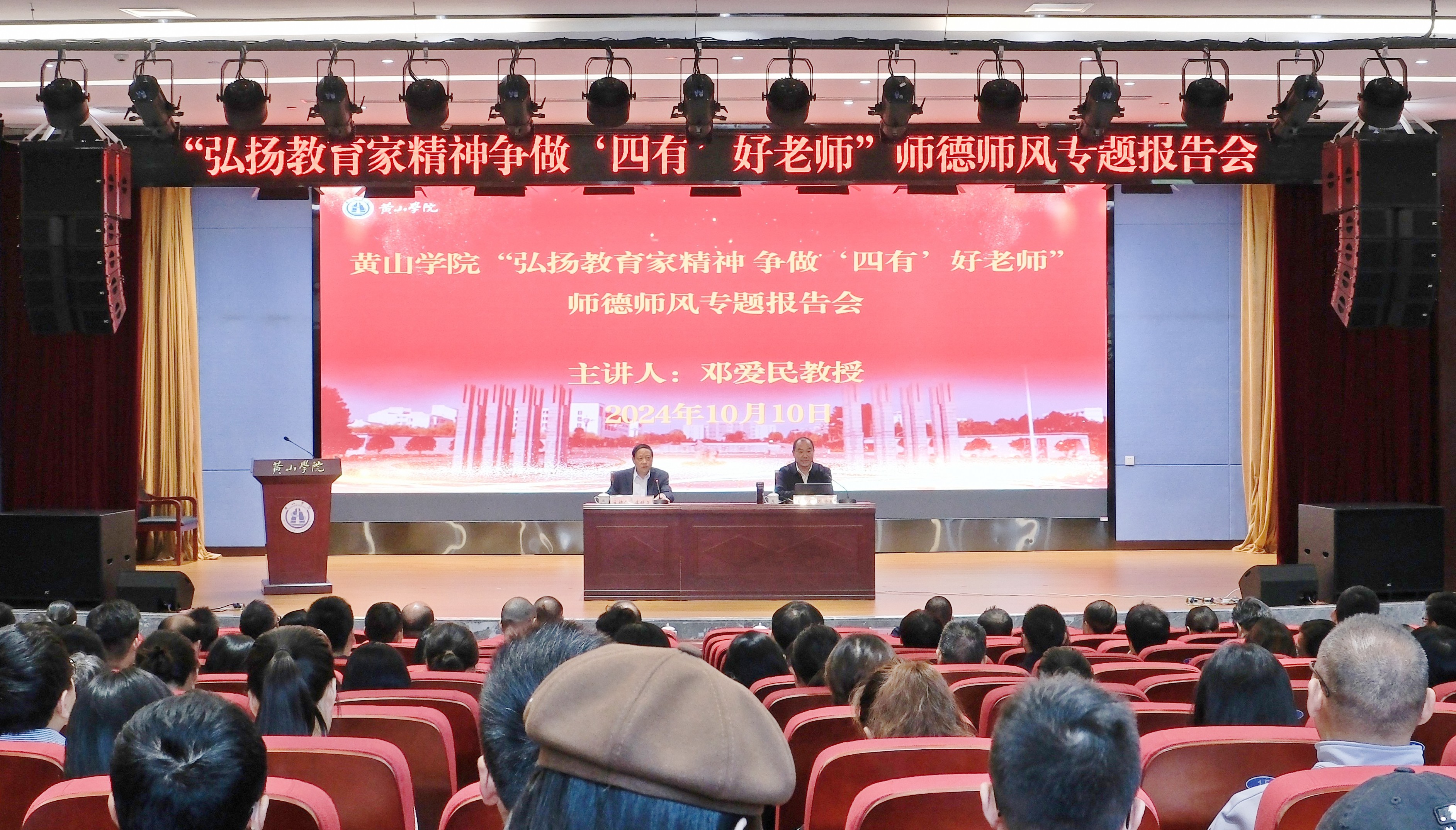 在深入学习贯彻党的二十届三中全会和全国教育大会精神之际,10月10日上午,我校在文博楼二楼报告厅举办“弘扬教育家精神 争做‘四有’好老师”师德师风专题报告会。中南财经政法大学旅游研究院院长邓爱民教授应邀来校做专题报告。校党委书记李铁范,党委委员、副院长张小明,校党委委员、组织部部长周权出席会议,报告会由李铁范主持。