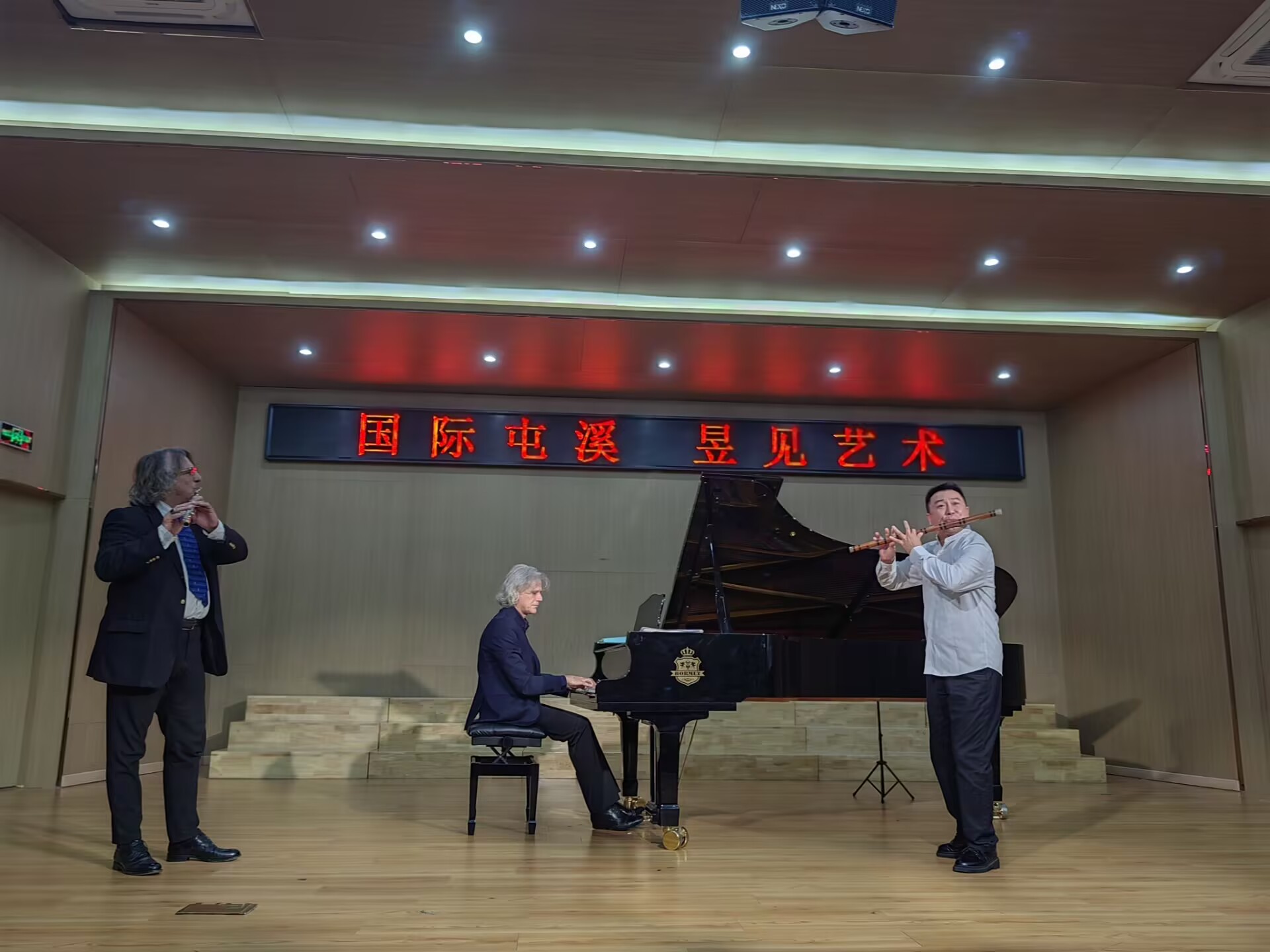 为增进交流,我校艺术学院音乐学专业教师和学生同台献演,分别表演了古筝和笛子独奏及徽州民歌改编曲女生四重唱《数麻雀》。该院吹奏竹笛教师张彪与钢琴家塞巴斯蒂亚诺·布鲁斯科、长笛演奏家安德里亚·切克默里即兴协奏了《友谊天长地久》,将音乐会推向了高潮。音乐会在女高音歌唱家齐娅娜·裘狄奇演唱的歌剧选段《饮酒歌》中落下帷幕。整场音乐会精彩纷呈,掌声不断。