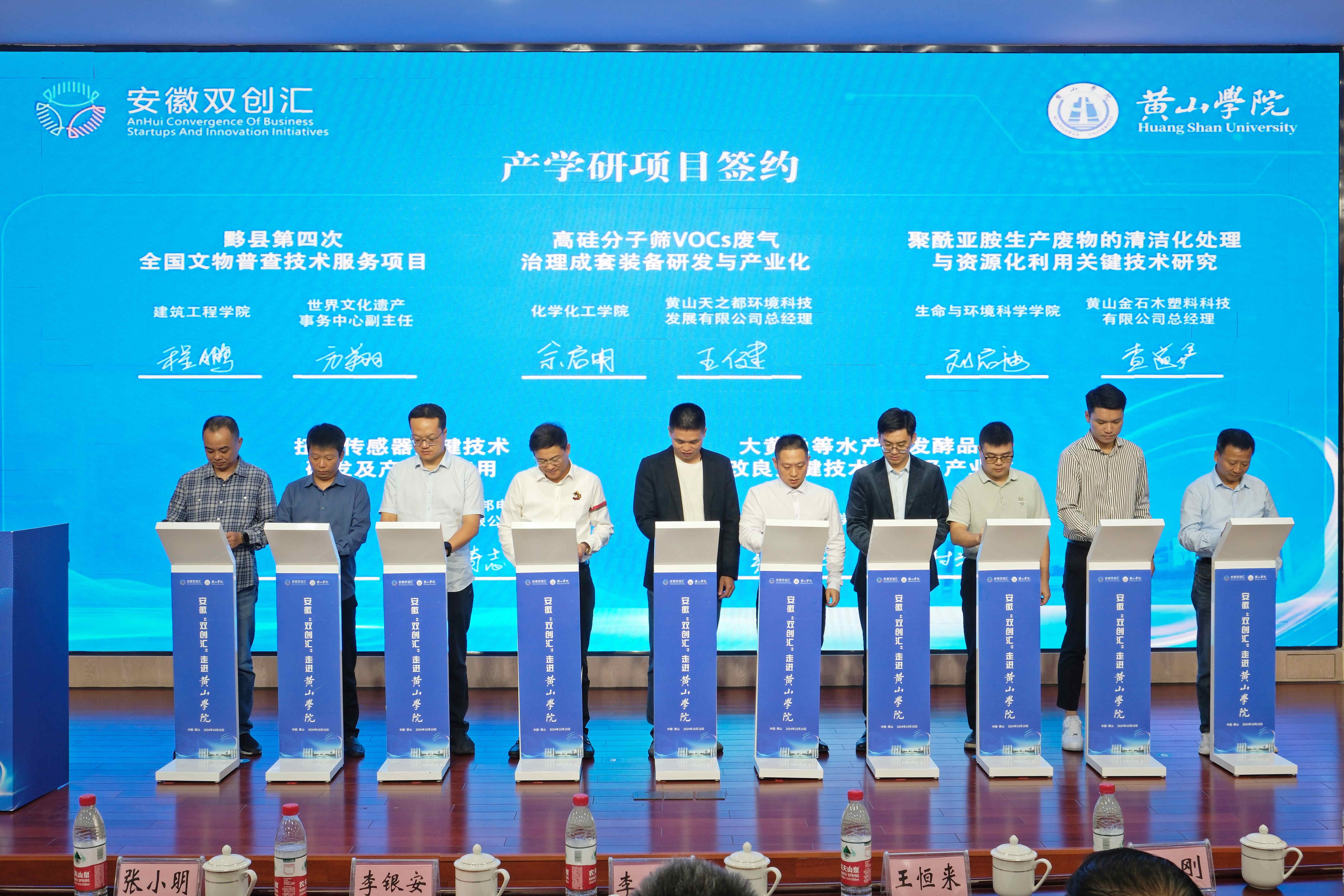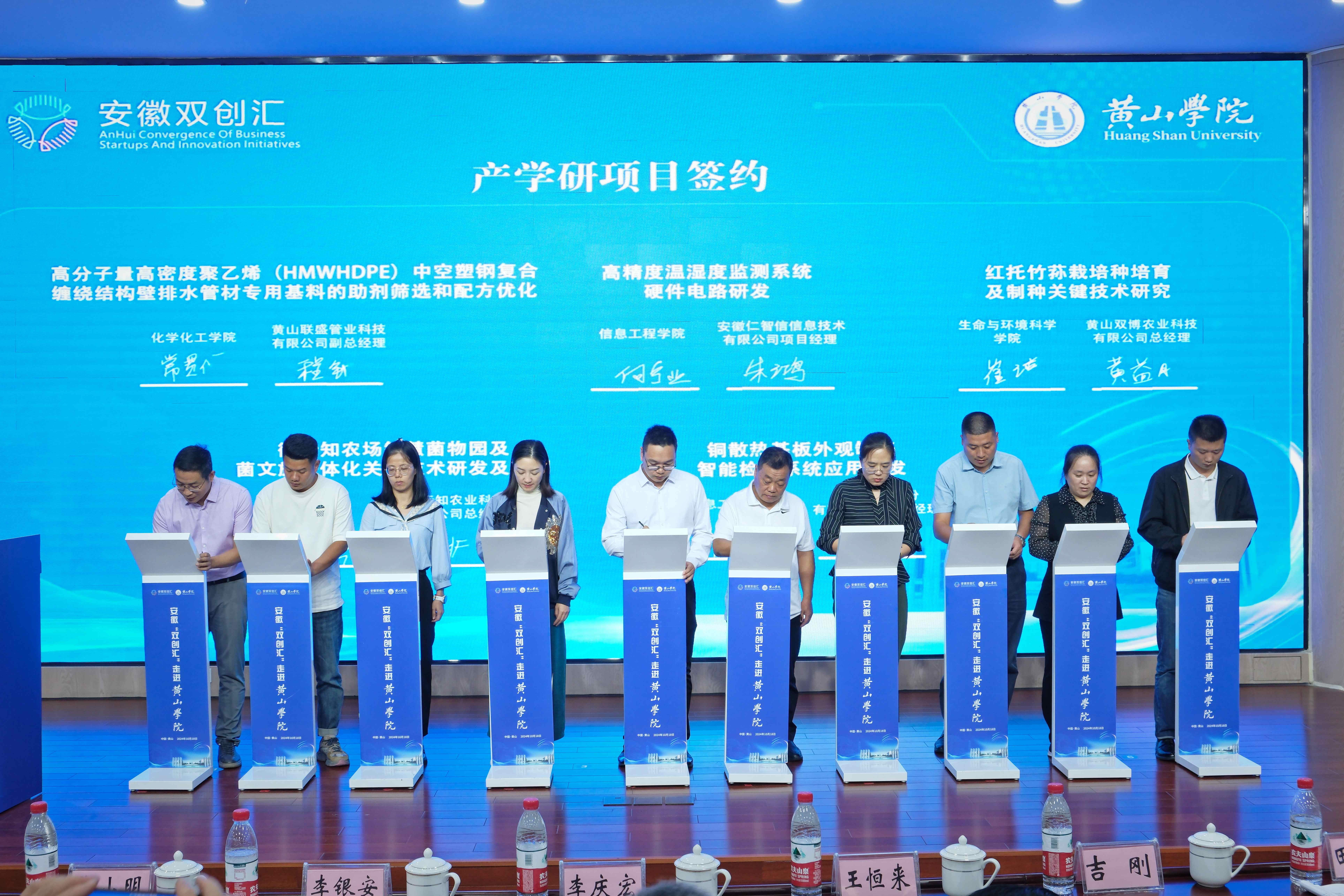 活动现场,我校与黄山高新区管委会签订了全面深化战略合作协议。我校黟县第四次全国文物普查技术服务项目、高精度温湿度监测系统硬件电路研发项目、微行知农场智慧菌物园及菌文旅一体化关键技术研发及应用项目等10组创新创业团队与企业签约合作。我校数字经济与大数据分析黄山市技术创新中心、绿色化工新材料黄山市技术创新中心、先进感知与智能控制黄山市技术创新中心等6家第四批黄山市技术创新中心单位获授牌。昌辉汽车转向系统黄山有限公司、黄山徽母实业有限公司等部分企业发布了技术需求。我校机电工程学院教授鲍婕、生命与环境科学学院教授柏晓辉、化学化工学院博士孙光映、信息工程学院教授陈珍海4位教师作了优秀科技成果路演。