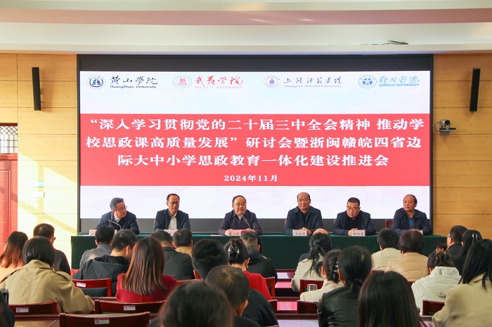 11月23日,“深入学习贯彻党的二十届三中全会精神 推动学校思政课高质量发展”研讨会暨浙闽赣皖四省边际大中小学思政教育一体化建设推进会在我校举行。校党委委员、副院长张小明出席研讨会并致辞,马克思主义学院党总支书记刘春安主持研讨会开幕式。四校马克思主义学院和黄山大中小学思政课一体化共同体成员单位教师代表70余人参加本次会议。