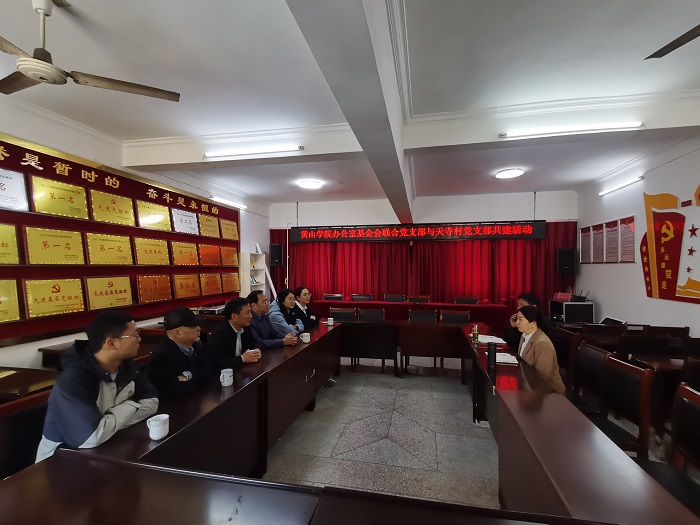 支部成员走进定点帮扶单位天寺村,天寺村两委班子成员和支部成员就帮扶工作和开展结对共建进行洽谈。天寺村党支部书记吴翠清对黄山学院一直以来的帮助表示感谢,并介绍了村里发展现状、面临问题和困难以及未来发展展望。党支部书记汪恭艳回顾总结了前期双方合作取得的成效,并结合学校办学资源优势对天寺村发展面临困难提出针对性帮扶计划和举措。