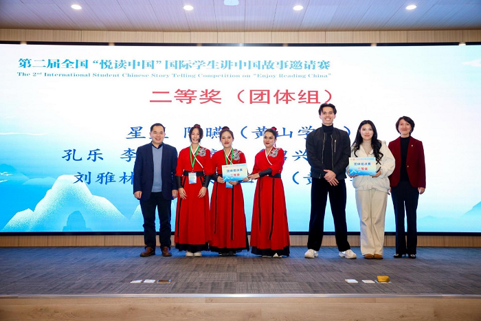 第二届全国“悦读中国”国际学生讲中国故事邀请赛共收到全国44所高校的140件作品,经专家评审,来自39个国家的107位选手的70件作品入围,共赴线下复赛和决赛盛会。评委从语言表达、故事内容、呈现效果等方面对选手进行综合打分,各参赛团队按照抽签顺序依次进行演绎。我校参加复赛两组团队讲述的主题为“老外所吃”和“花木兰的故事”,以新颖的呈现形式和深刻的内涵赢得了评委的一致好评,从复赛的17支团体队伍中脱颖而出,双双晋级决赛。决赛采用现场抽签方式抽取比赛主题及出场顺序。我校两组团队分别以“中国科技”与“城市文化”为主题讲述中国故事,回答评委提问,最终均获得团体组二等奖。