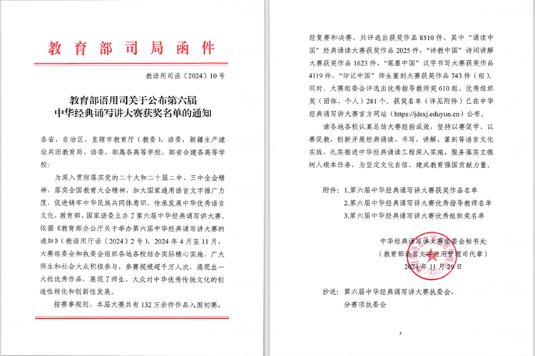 近日,由教育部、国家语言文字委员会(简称国家语委)共同主办的第六届中华经典诵写讲大赛全国总决赛获奖名单正式公布。教育科学学院教师郑藤书法作品斩获“笔墨中国”汉字书写大赛教师组硬笔类二等奖。