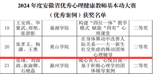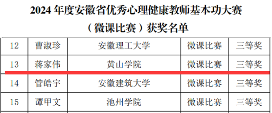 近日,安徽省教育厅公示了2024年度全省优秀心理健康教师基本功大赛获奖情况,我校选拔与推荐的心理健康教育优秀教师在三个竞赛组中均斩获佳绩,荣获优秀咨询案例二等奖1项、微课教学比赛三等奖1项、优秀论文2篇。
