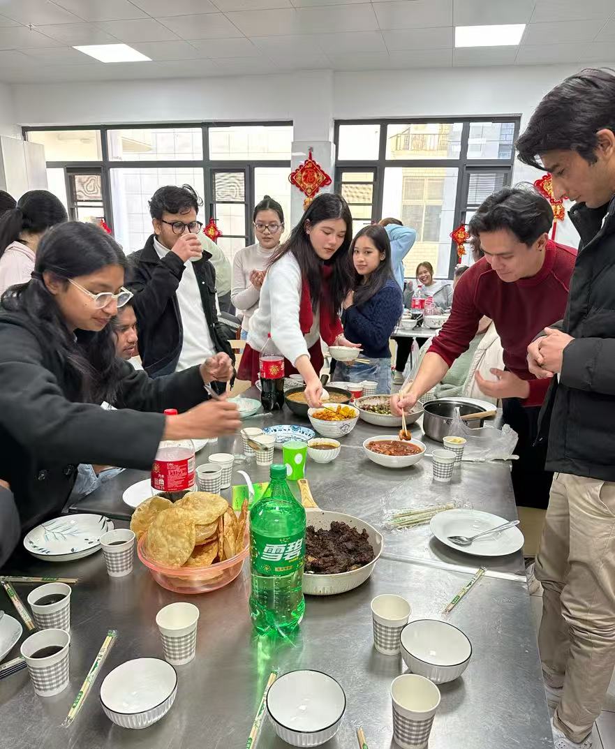 色彩斑斓、香气四溢的美食摆满餐桌,同学们穿梭其间,品尝各类佳肴。他们举杯互敬,用不同语言传递着相同的新春祝福。欢声笑语交织,大家以舌尖为纽带,跨越国界,共享多元文化交融的欢乐,温暖情谊在美味中升温。