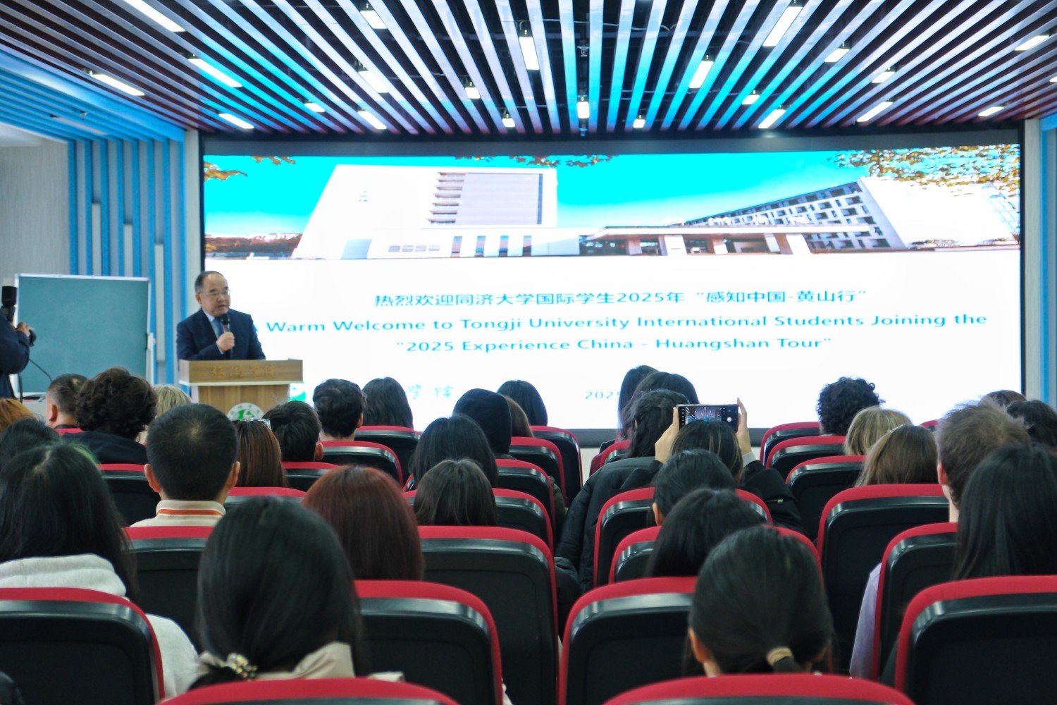 张小明在致辞中代表学校向同济大学研学团表示热烈欢迎,并简要介绍了学校的办学历史、办学特色及来华留学教育发展成果。同济大学留学生办公室副主任沈佳君期待通过此次研学进一步深化两校教育交流与合作。