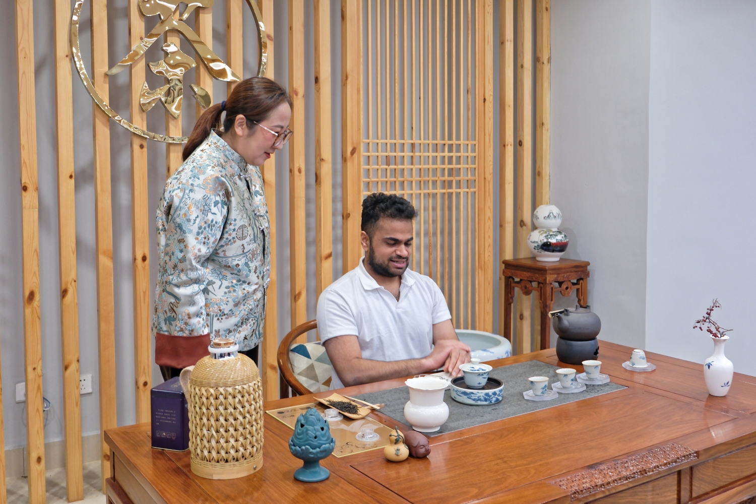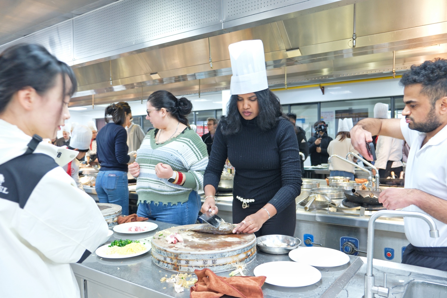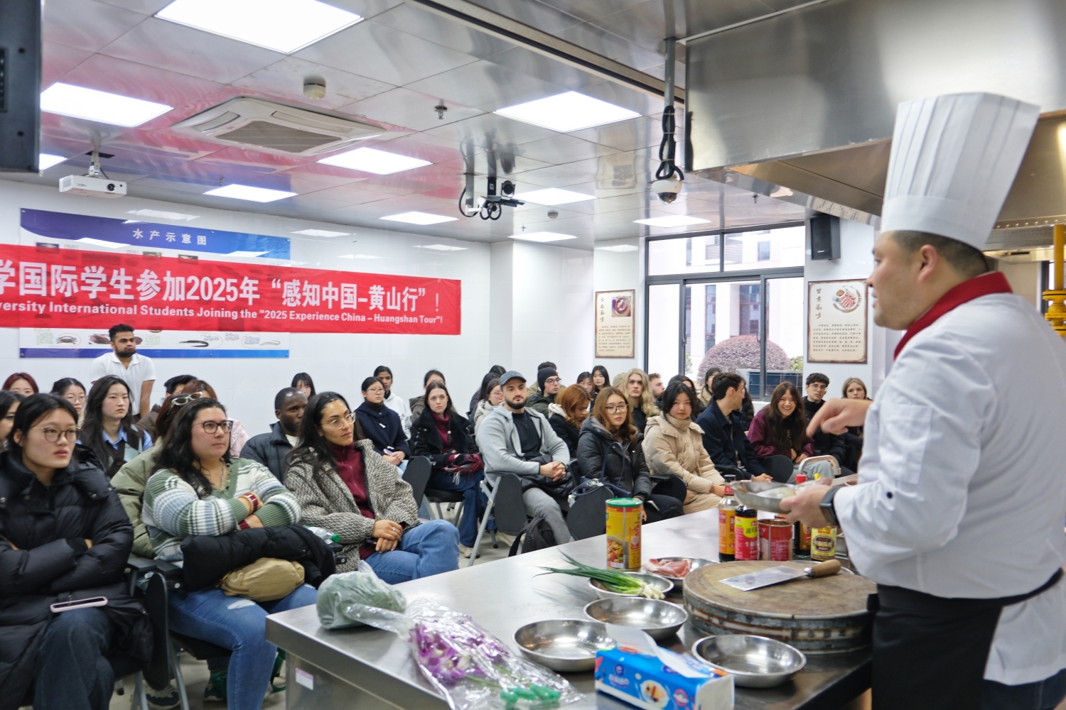 开班仪式结束,代表团开启徽州文化体验之旅。旅游学院副教授代华博士以“徽州文化溯源”为主题,讲解了徽州文化的历史演进与核心内涵。在茶艺实训室,通过陈丽威老师的茶艺演示,留学生们体验了徽茶文化的仪式美学。午间实践环节,烹饪实训室主任黄玉海指导留学生亲手制作了徽菜经典“臭鳜鱼”。